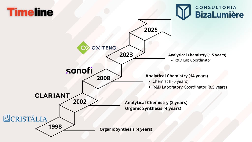 He then built a solid career in Analytical Chemistry, working in R&D Analytical Laboratories. He started in this area at Clariant, for 2 years, but it was at the pharmaceutical company Sanofi where he refined his role as a Research Analyst for 6 years, focusing on the development and validation of new analytical methods using various techniques (HPLC, UPLC, GC-FID, Dissolution, etc.). He was later promoted to R&D Analytical Laboratory Coordinator within the same group, a position he held for 8.5 years. Following this cycle, he joined the chemical company Oxiteno, where he also served as R&D Analytical Laboratory Coordinator for another 1.5 years.